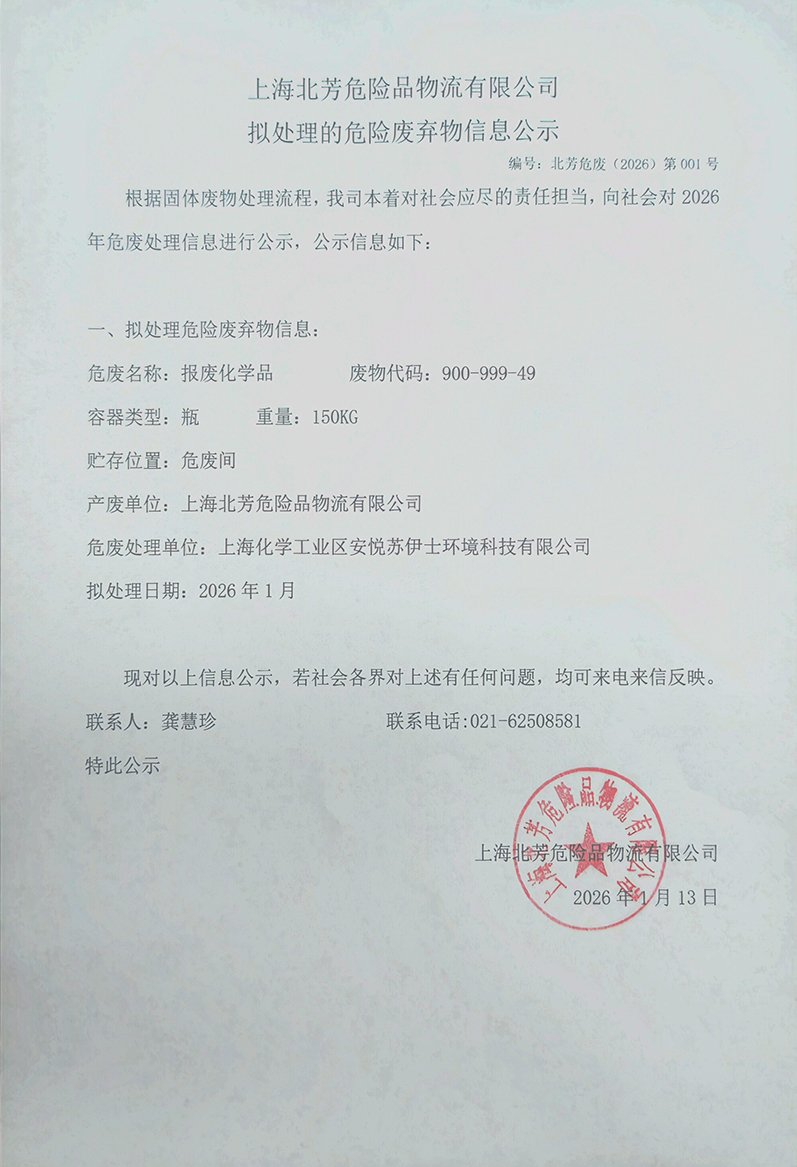 上海博彩平台大全危险品物流有限公司拟处理危险废物的信息公示2026001