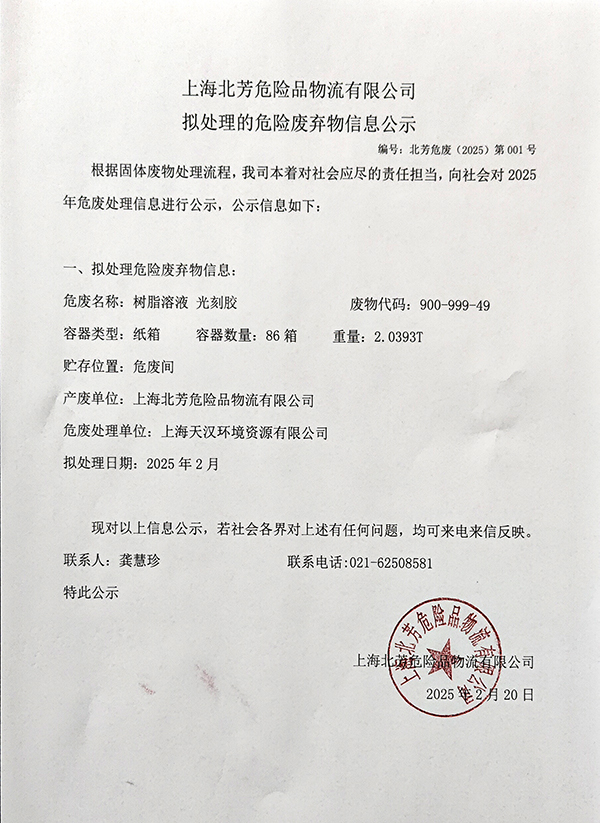 上海博彩网站推荐危险品物流有限公司拟处理危险废物的信息公示2025001