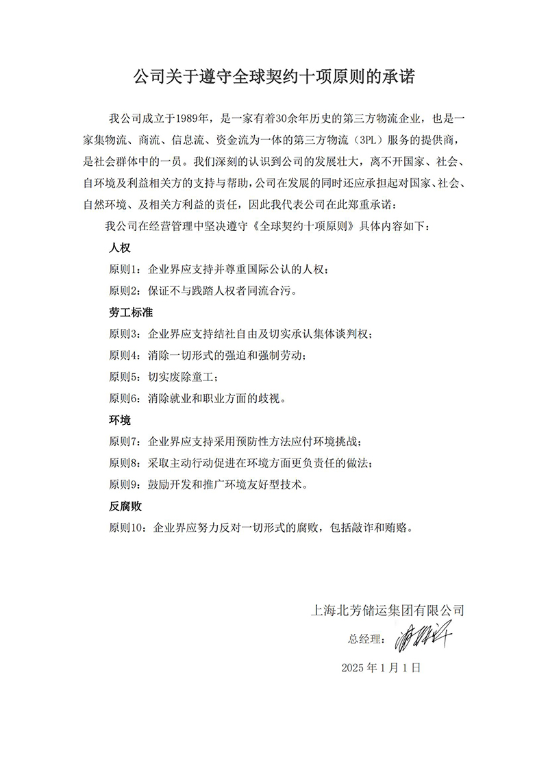 博彩网站推荐关于遵守全球契约十项原则的承诺